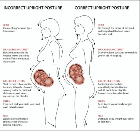 In pregnancy, postural strain in your neck, shoulders, mid back and low back increases as your baby grows. Below is a great illustration to improve your posture and reduce pain.