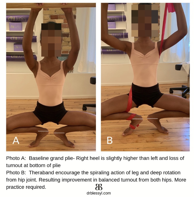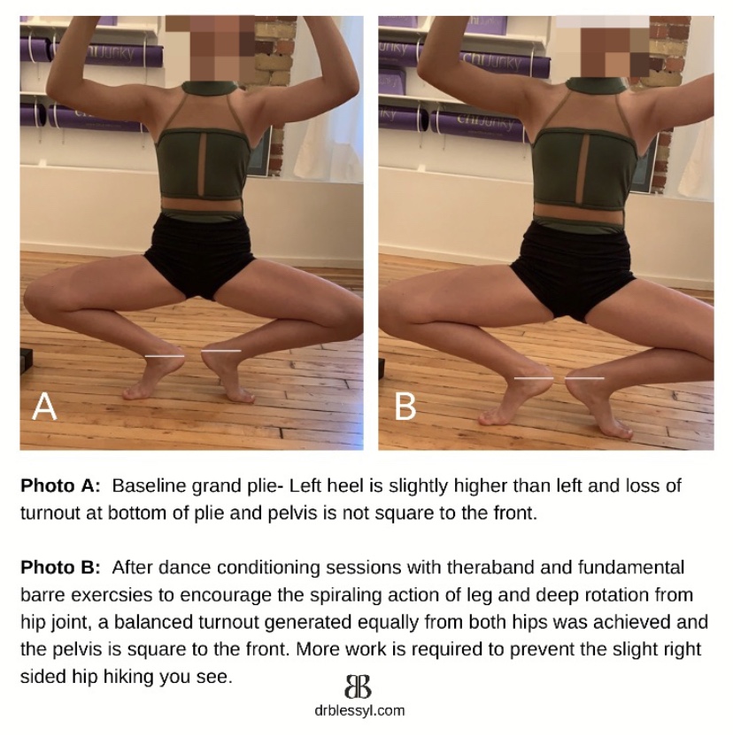 The result was level heels at the bottom of grand plie which improved a balanced turnout generation from not hips as well as stability from the lumboplevic area.